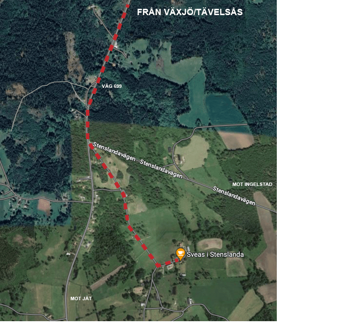 Följ landsvägen 3 km från Tävelsås, följ skylt mot Stenslanda och i första korsningen tar ni vänster.