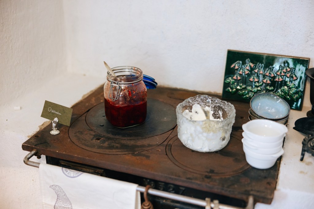 Vår meny är okomplicerad: Vi serverar ostkaka med sylt och grädde. Kaffet bryggs vid bordet i perkolator precis som förr, det finns även en mjuk kaka, småkakor och hemgjord saft.